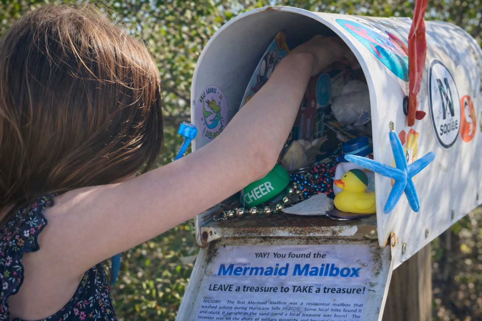 Imagine cruising through the calm waters of the Santa Rosa Sound when you spot it—a colorful, weathered mailbox decorated with mermaids, stickers, and handwritten notes.